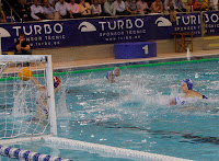 Eli Gazulla (CNS), mejor portera, blocando a la boya alcorconera Pilar Peña (izda) y en una brillante intervención